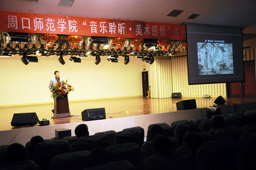 2011年4月12号晚,我校美术学院理论教研室主任张迎甫老师在音乐厅作了主题为“传统中国画之美与中国艺术精神”的讲座。教务处主任金素梅、美术学院副院长郑芳、周晓峰与众多老师和学生聆听了此次讲座。 讲座的内容主要分为三大部分:首先,介绍了绘画的概念及其主要种类。其次,结合中西绘画比较,阐释了中国画的艺术特色、审美韵味和独特的艺术美。如同样是人物画,清代郎世宁的《康熙图》与同时代金农的《自画像》相比较,张老师指出西方的写实人物画注重光影和空间,中国的写意人物画注重提炼和概括,在表现对象的精神风貌与风度神态方面存在较大差异。最后,通过深度解读中国传统经典绘画作品,提出了中国传统绘画“明史?载道?畅神”的主要艺术精神,引领师生感知和了解了传统中国画之美与中国艺术精神,让大家领悟到中华文化的勃勃生机与恒久魅力。 本次讲座是“音乐聆听?美术感悟”系列讲座活动的第四讲。讲座内容丰富,讲述幽默风趣,现场气氛活跃。通过张老师的讲解,隐藏在一幅幅精美画面中的故事,瞬间变得生动鲜活起来。大家忍不住屏气敛声,侧耳倾听,仿佛能够听到当年画家的毛笔划过纸张的沙沙声,还有他们工作时的细碎耳语,也许这就是传统中国画之美与中国艺术精神强大的生命力吧。讲座在师生们热烈的掌声中结束。此次讲座极大地开阔了学生们的视野,提升大家的审美修养,让在座的每位师生更加深刻地体会到了中华文化的独特魅力。(文/郭梅 窦冰 图/王瑞华 张瑾瑾)
