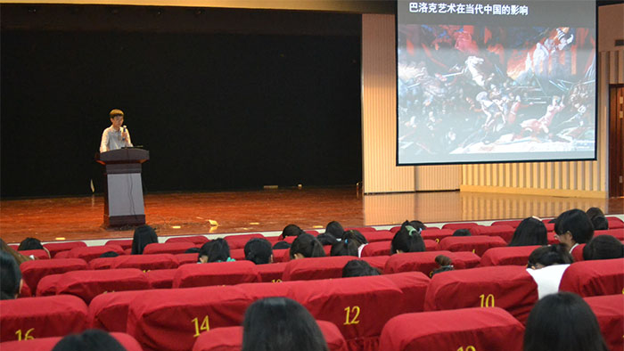 9月22日晚,文学院300余名学生参加了音乐厅“音乐聆听?美术感悟”系列讲座本学期第一讲“从天国到凡尘——巴洛克时代的欧洲绘画与当代中国主题性绘画”。美术学院的梁烜彬老师担任主讲人。 (作者:陈钟林 摄影:李学勤)
