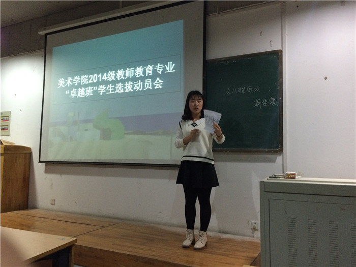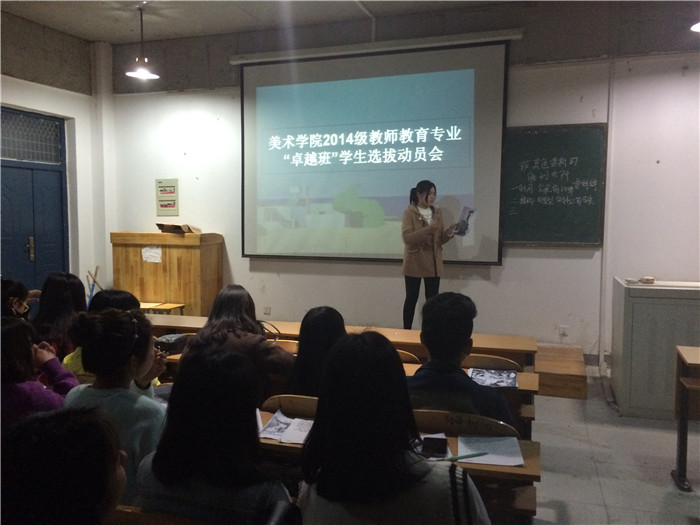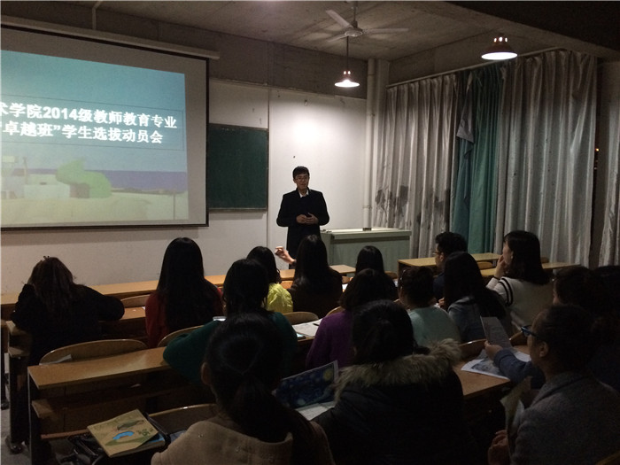 为了响应学校关于提高教师教育质量的教育方针政策,美术学院积极开展2014级美术学专业“卓越班”选拔赛,在贺洛乙院长的领导下,李翔老师和梁烜彬老师积极准备和参与了本次选拔比赛。 2016年3月18号,我院在美术学院教学楼艺5教室举办了本次讲课活动。通过2014级美术学学生精彩的比赛角逐,共选出5名学生。比赛过程当中,每位选手都有精彩的讲课,内容涉及到了中学美术课的各种知识,选手们纷纷运用亲切的语调,巧妙的教学设计,多元化的多媒体辅助教学,吸引了我们在场的每位同学,其中部分选手的精彩讲课更是得到了评委的一致好评,现场气氛掀起了高潮。当最后一位选手讲完课后,评委为本次活动进行了点评。
