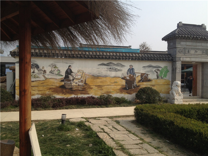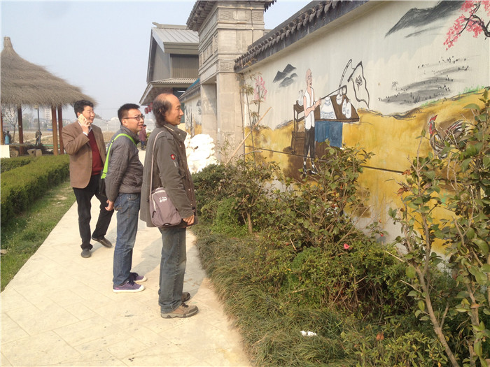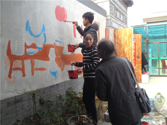 3月27日上午,美术学院副院长贺洛乙,南京艺术学院阳山写生基地总经理傅红庚到阳山得雨居指导2013级绘画学生绘制墙体彩绘。贺院长亲自动手示范了绘制墙画的方法,细致的安排了墙体彩绘的注意事项。
