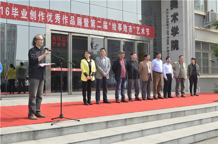 书画飘香,群贤毕至。2016年5月10日上午10点,365bet备用“艺术让生活更美好”——2016毕业创作优秀作品展暨第二届“绘事致市”艺术节在美术学院开幕。入选本届毕业创作优秀作品展的是油画、中国画、装饰、水彩、动画五个专业方向中评选出的共计139名同学的229件作品;第二届“绘事致市”艺术节师生们的作品达433件。开幕式由美术学院副院长贺洛乙主持,院长吴京垿致开幕辞,陈大宾先生作为嘉宾代表致贺辞。 出席开幕式的有:学校党委宣传部部长侯捷、学校学生处处长张苏峰、学校科研处副处长王富强、学校团委书记张鹭、美术学院党总支书记桑林、党总支副书记高菊以及国风艺术文化中心董事长郭飞先生、周口市收藏家协会副会长陈大宾先生、北京宏正国际拍卖有限公司邝有勋先生。在校师生200余人参加了开幕式。 本次活动主办单位: 365bet备用 本次活动协办单位: 国风艺术文化中心 源茂轩画廊 慧轩美术馆 北京宏正国际拍卖有限公司
