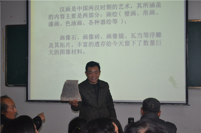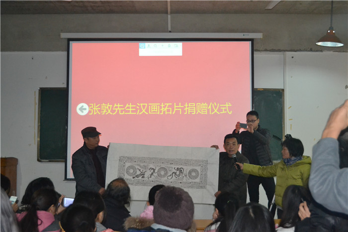 12月13日上午,资深汉画收藏家张敦先生在美术学院举办“汉画折射出的十种思想精神”专题讲座。讲座在我院二楼多媒体举行,美术学院院长吴京垿、副院长贺洛乙、国画、油画、装饰教研室主任以及100余名师生参加了此次活动。 张敦先生以汉砖为例介绍了汉画的表现方式、发展历程、研究意义等,重点阐述了汉画折射出的包括“对美好生活向往追求 ;对艺术大胆创新的探索精神;团结互助的友爱精神;人类社会与自然万物的和谐思想;尊崇道德修养、礼仪待人的思想境界”等十种的思想精神,劝诫当代师生的学习、创作要多从传统文化中汲取营养,获得灵感。 讲座结束后,张敦先生向美术学院捐赠了自己所收藏的8幅珍贵汉画拓片,并现场教授学生拓片的制作。美术学院院长吴京垿随即表示邀请张敦先生为美术学院特聘教授,对张敦先生的到来和捐赠表示感谢。 此次讲座为美院师生提供了一个学习汉画文化的宝贵机会,使美院师生对中国优秀传统文化有了更深一步的了解。 文/张迎甫 图/蓝天